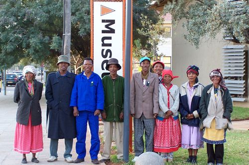 In 2004, the Kuru artists pose in front of the National Museam of Botswana in Gaborone, Botswana, getting ready for the opening night celebrations for their Retrospective.